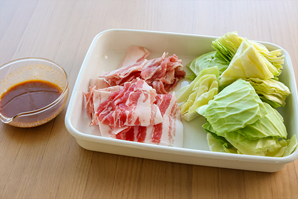 豚肉は4㎝長さに切る。キャベツはざく切りにする。