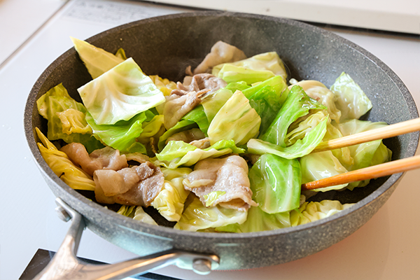 肉の色が変わったらキャベツも加えてしんなりするまで炒める。