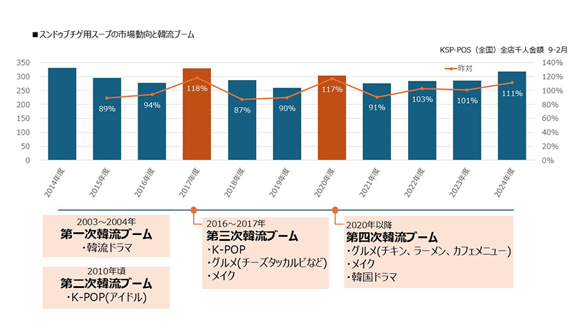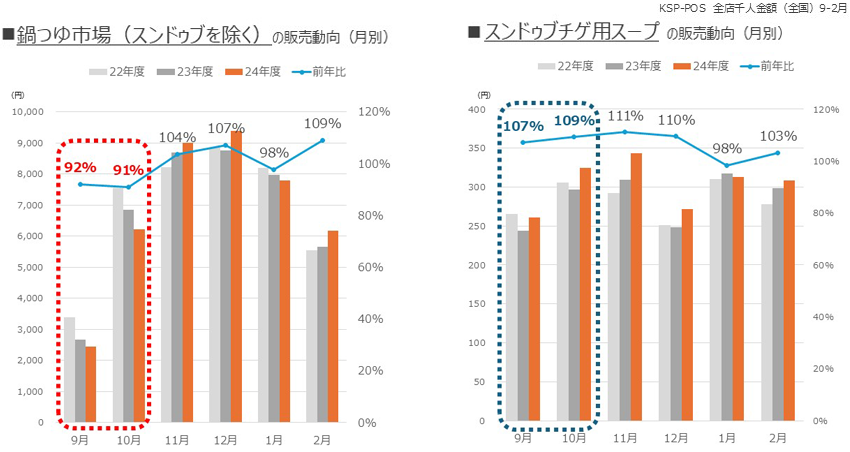 秋になっても暑さが残り、鍋の時期は年々後ろ倒しになっています。その影響で、2024年度の鍋つゆ市場における9-10月は前年を下回る推移となりました。特に2024年度は野菜の高騰も続いたことが前年割れの要因だったと考えられます。一方で、スンドゥブチゲ用スープの市場は同時期でも好調に推移し、鍋とは異なる動きを見せました。この背景には、大きく2つのポイントがあると考えられます。