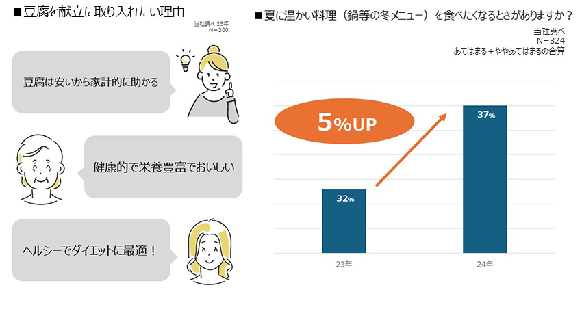 スンドゥブは手軽に楽しめる温かいスープ料理であり、暑さの残る時期でも、冷房冷えや朝夕の寒暖差に対応した温活需要に適していると考えられます。実際、「夏に温かい料理を食べたくなる時がありますか?」というアンケート結果では2023年度から5%伸びており、暑さのある時期でも温かい料理を求める人が増えていることから、スンドゥブが受け入れられたと考えます(当社調べ N=824)。