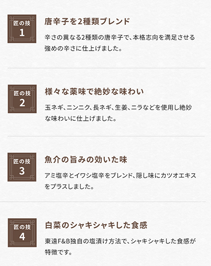 「匠の技」とは、モランボンが培ってきたキムチの味づくりのノウハウ。韓国産原料のおいしさを引き出し、深いコクと辛さを実現しました。