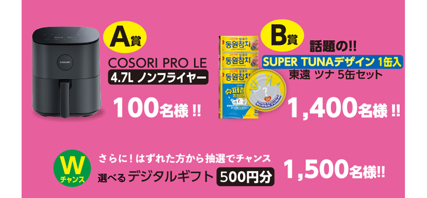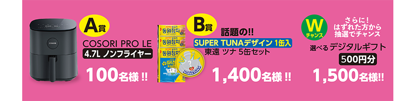 | B賞 | 1,400名様 | 東遠ツナ5缶セットSUPER TUNAデザイン1缶入 |