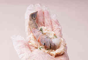 鶏ひき肉にマヨネーズ、塩、片栗粉、ナンプラー、小ねぎの刻んだものを入れて混ぜ合わせ、 2 のえびを包むようにえび団子を作ります。