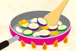 フライパンにオリーブ油を入れ、野菜に焼き色をつけます。