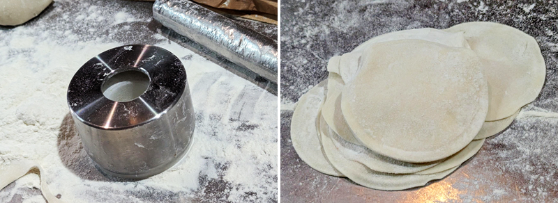 次に、生地を伸ばす工程です。以前は麺棒で伸ばしていたそうですが、現在はパスタマシンを使って均一な厚さに伸ばしてから型抜きを行っています。型抜きには特注で作られた専用の型が使われ、皮の縁の部分が薄くなるように調整されています。この厚さの違いが、美味しい餃子にとって重要なポイントだということです。