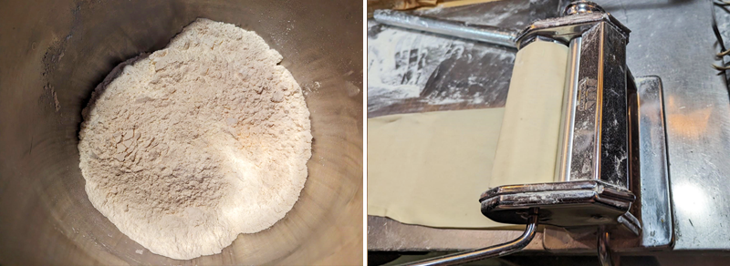 4種類の粉のブレンド粉とパスタマシンで均一に伸ばす工程