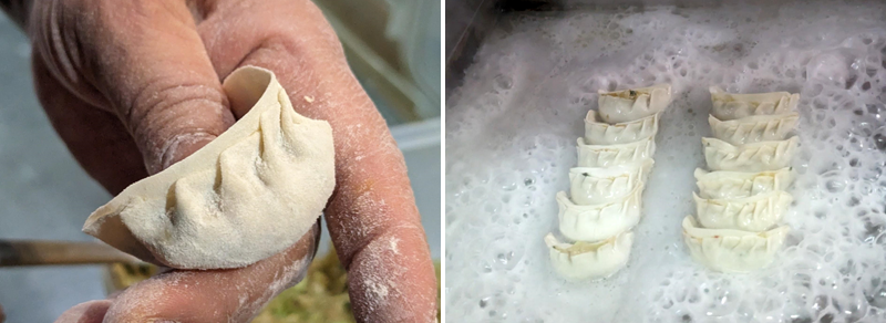伸ばしたての皮には餡をたっぷり包み込むことができます。ひだを均等に刻んで閉じれば完成です。熱々に熱した鉄板に餃子を並べて、お湯で溶いた小麦粉を投入して蒸し焼きにします。これは焼き色の判断とパリッとした食感を付けることが目的で、大きな羽根を付けることが目的ではないそうです。