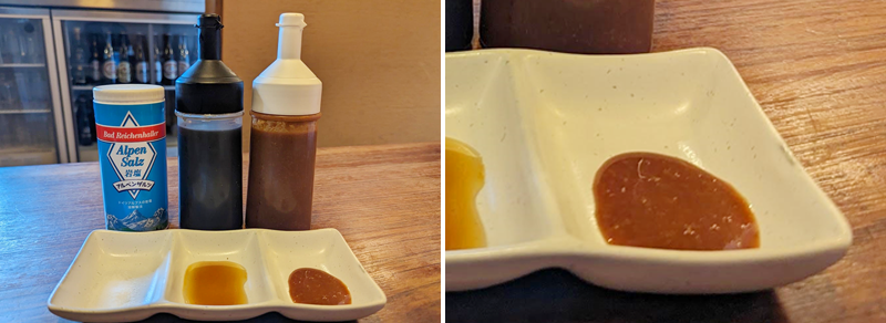 大鳳餃子では、3種類のつけだれでプレーン餃子の味の変化を楽しめるような提案もしています。オーソドックスな酢醤油ベースの餃子のタレに加えて餃子の味がダイレクトに感じられる岩塩、また神戸ということで味噌ダレも用意されています。