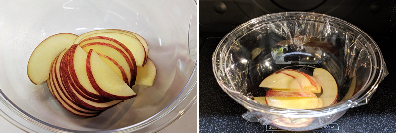 通常の作り方だとリンゴをゆっくりと煮込みますが、今回はレンジを使った時短レシピで。リンゴ1個分を薄くカットしたら砂糖をまぶして、ラップをして電子レンジで2分くらい加熱します。